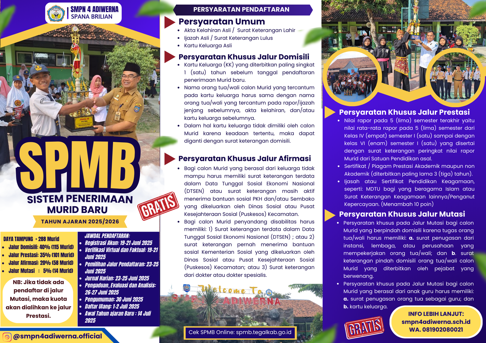 Selamat datang di Website resmi Sekolah Menengah Pertama Negeri 4 Adiwerna. Di era digital saat ini, website sekolah merupakan pintu gerbang informasi terdepan sebagai sarana untuk menyebarluaskan berbagai publikasi terkait kemajuan pendidikan dan pencapaian SMP Negeri 4 Adiwerna terkini.